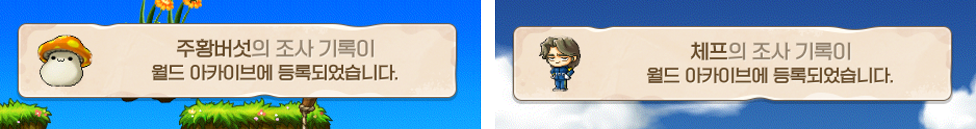 ■ 월드 아카이브 시작 후 메이플ID 내 모든 캐릭터로 조사 기록을 수집할 수 있으며, 수집한 기록은 메이플ID 내 모든 캐릭터가 공유