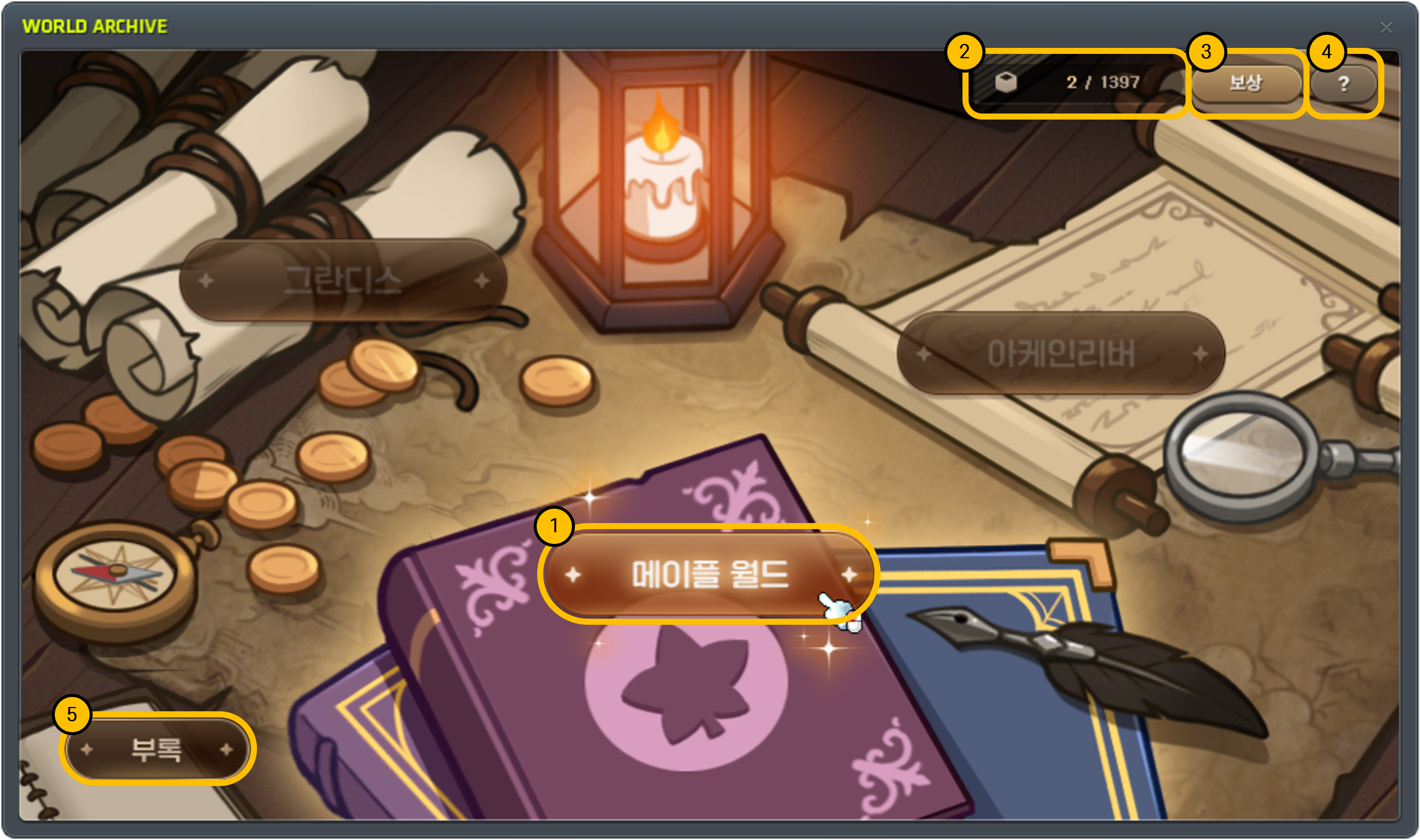 ■ 월드 아카이브 해금 시 자동으로 해금되며, 메이플스토리의 역사, 종족, 기타 용어 등 확인 가능