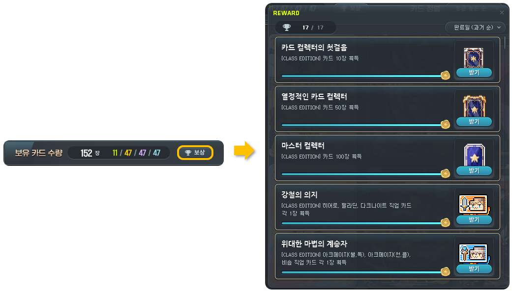 ■ 등록한 카드의 누적 수량 및 특별한 조건 만족 시, 컬렉션 카드 UI의 [보상] 버튼을 눌러 수집 보상 획득 가능