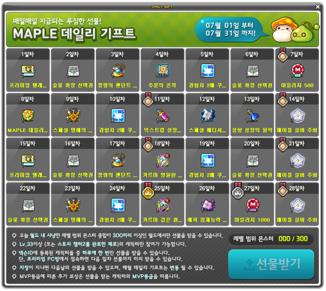 ■ 월드 내 사냥한 레벨 범위 몬스터 총합이 300마리 이상일 경우에 선물 수령 가능